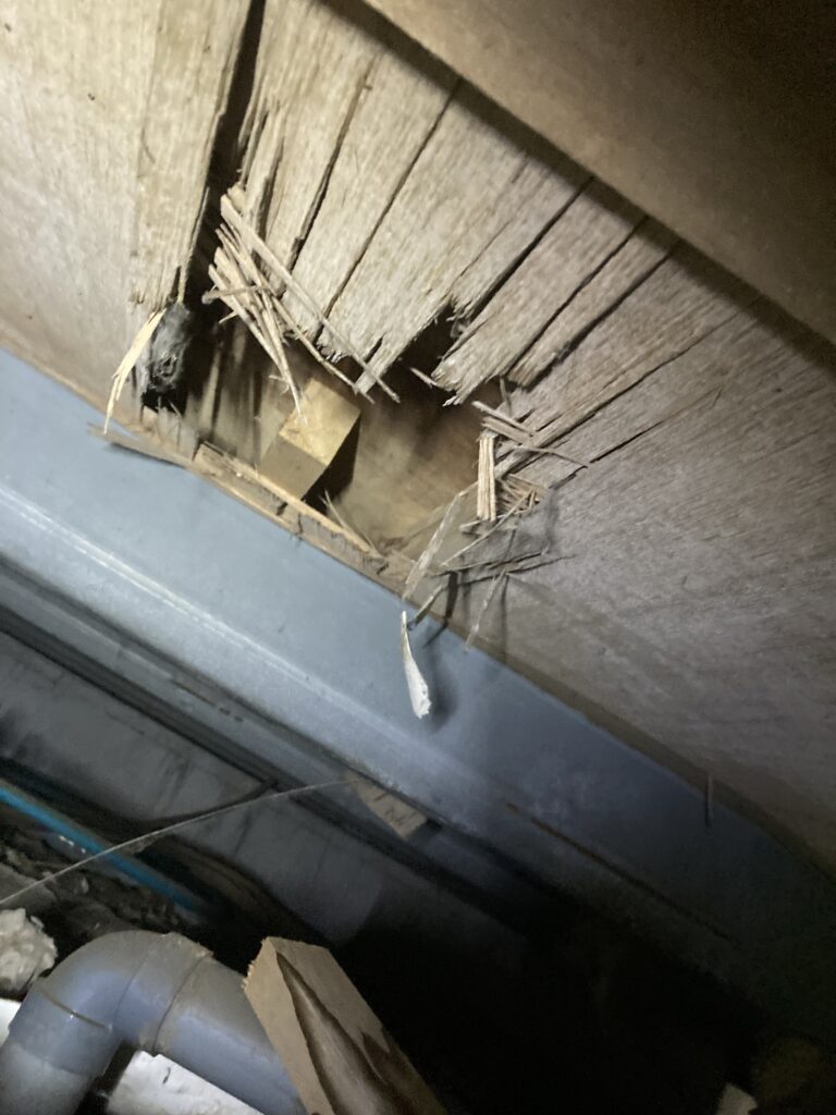 今回のアライグマは、お風呂下の配管周りの穴を広げた侵入口から、お風呂の天井裏あたりに住み着いていました。