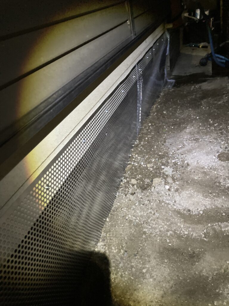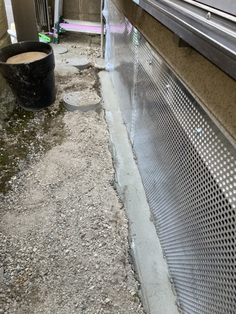 【画像:パンチングメタルによる広範囲の封鎖】![]() ![]() ![]() ![]() ![]() ![]() | パンチングメタルによる強固な封鎖 建物床下の隙間がかなり広かったため、建物下周りの2面分をすべてパンチングメタルで封鎖しました。アライグマが戻ってきても絶対に侵入できないよう、資材で頑丈に施工しています。 |